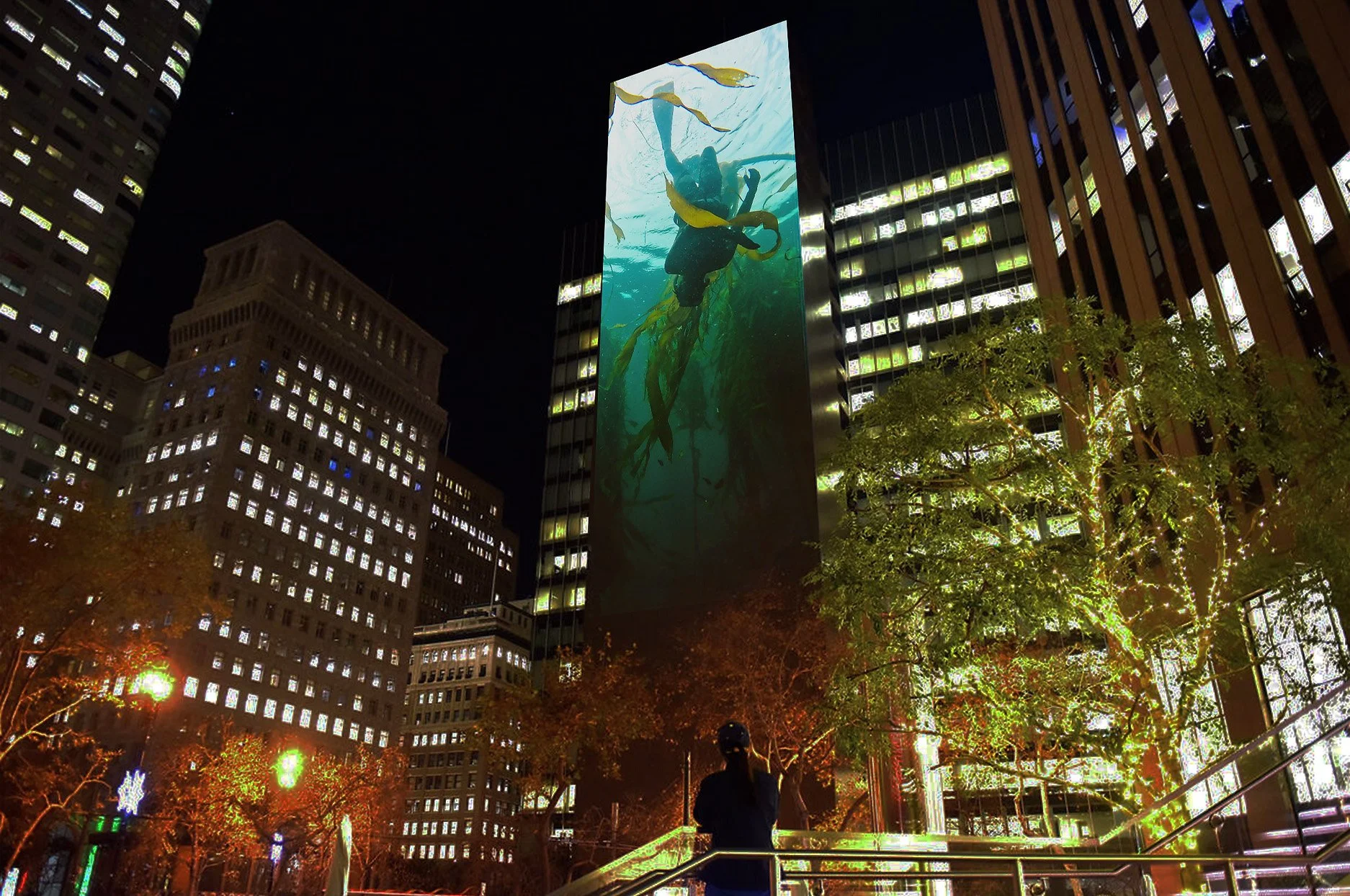 The large scale public art work features underwater cinematography of submerged dancers interwoven with a hybrid of video, animation and AI of the California Coast, showcasing the beauty and fragility of humanity, caught between a natural abundance and a technological revolution. Created in collaboration with LightHarvest Studios